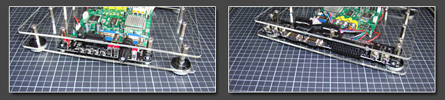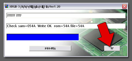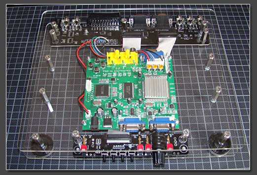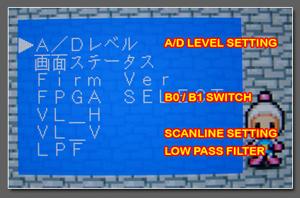 to the picture, just like the XRGB-3 does with 240p input signals. By adjusting a potentiometer the scanline density can by adjusted and by shortening two pins on the board (the blue screw terminals shown on